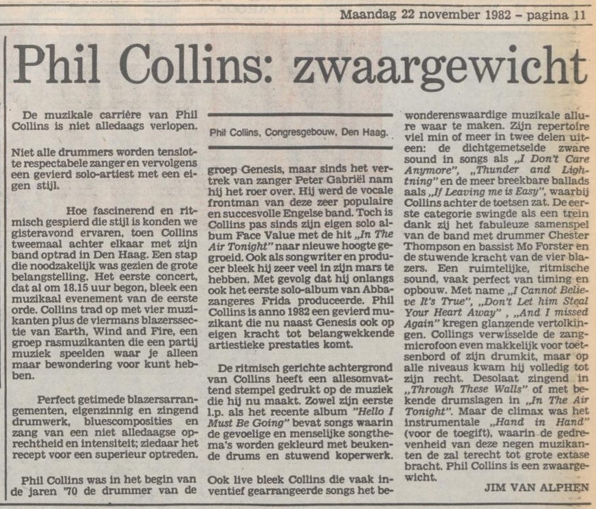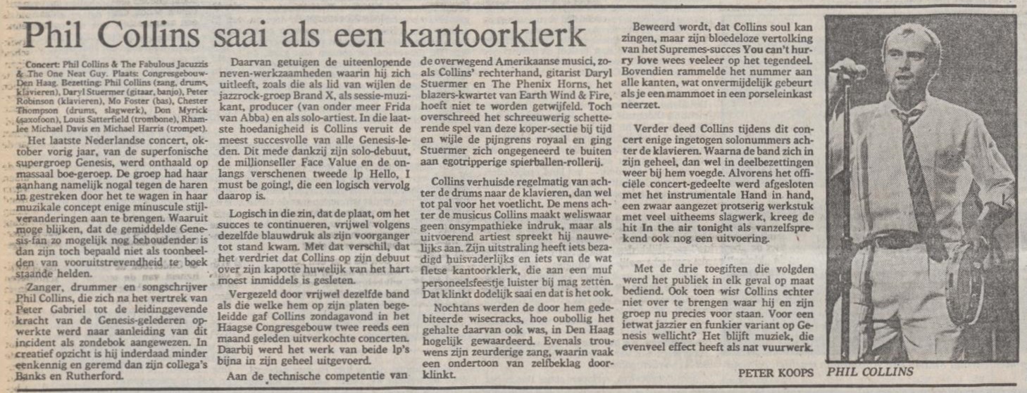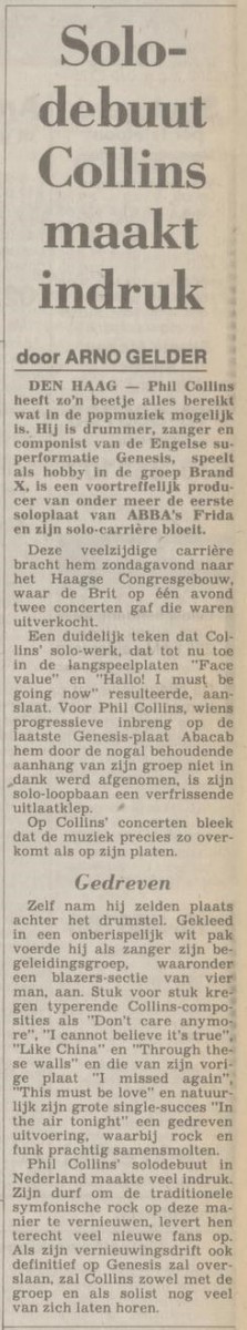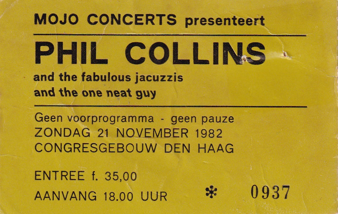 Collins played his first two concerts at the Congresgebouw in The Hague, Netherlands on November 21st 1982. Genesis had played the Congresgebouw in 1976, promoting ‘A Trick Of The Tail’. Peter Gabriel and Brand X played there in 1978, and also Steve Hackett played his first Dutch solo gig at the venue.