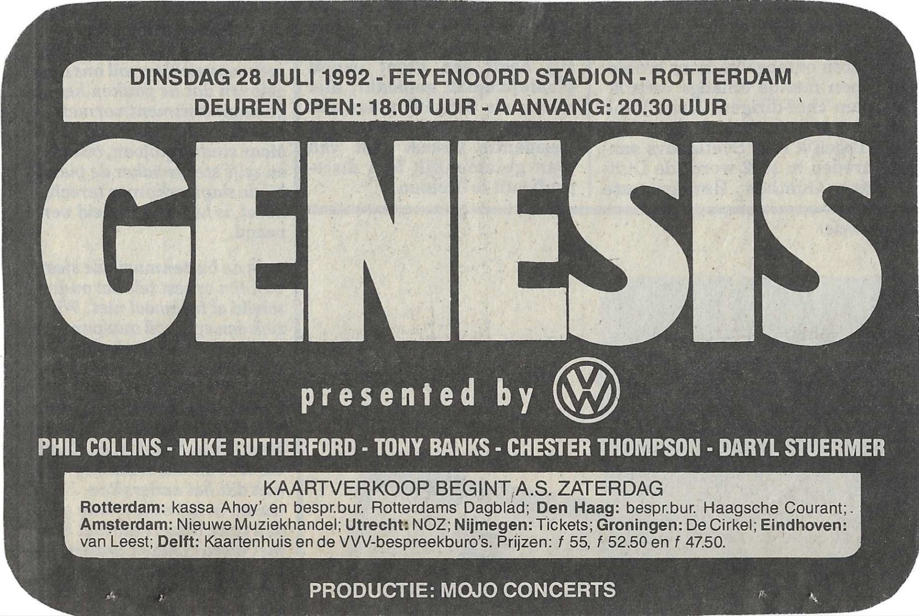 I have a photo taken inside De Kuip of a remembrance wall with all the artists that played the stadium and the dates they were on. Somehow there are two dates penned down for Genesis in 1988 which ofcourse must be a mistake. The ’92 gig was marked as Genesis’ last performance in The Netherlands untill their comeback in 2007. Reviews were mostly good, going from ‘A slow start for Genesis’ to ‘Technical perfection’ and ‘Phil Collins, master of entertainment’.