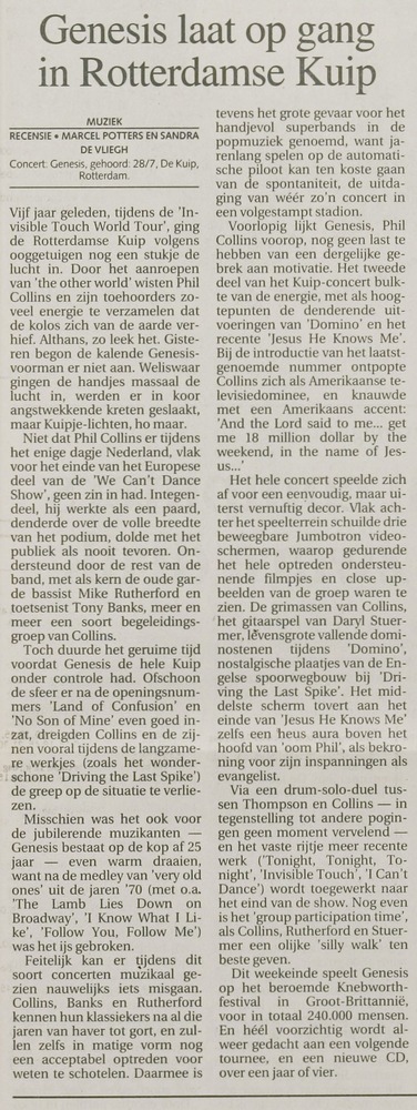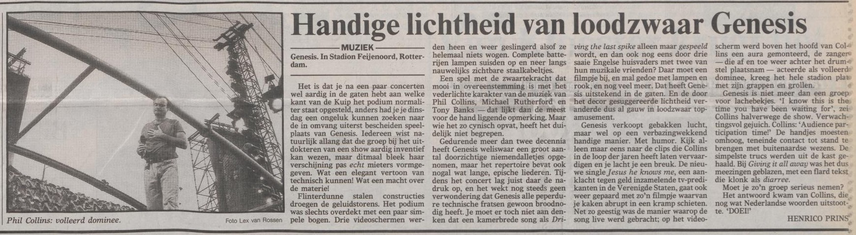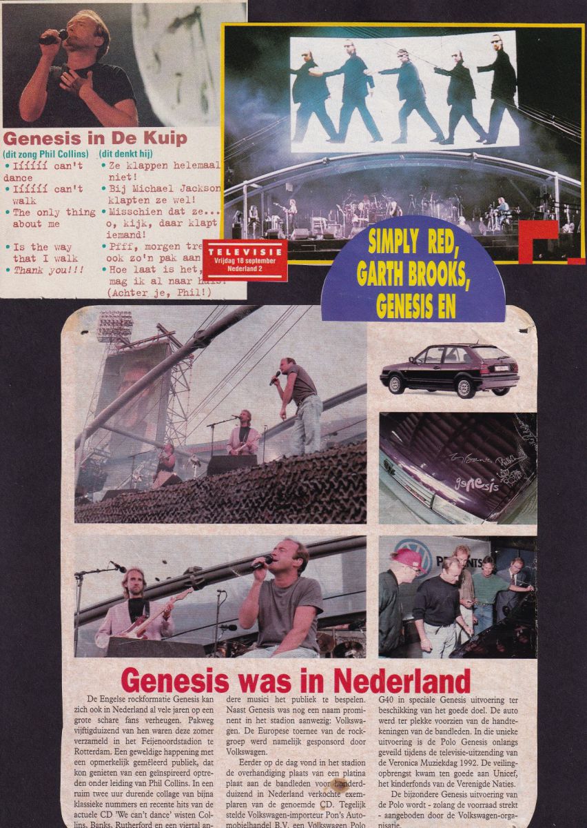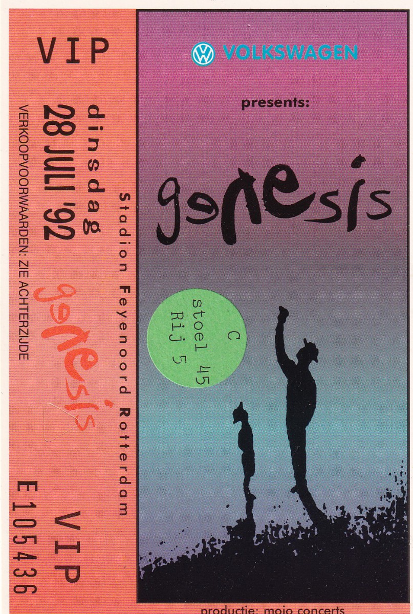 I have a photo taken inside De Kuip of a remembrance wall with all the artists that played the stadium and the dates they were on. Somehow there are two dates penned down for Genesis in 1988 which ofcourse must be a mistake. The ’92 gig was marked as Genesis’ last performance in The Netherlands untill their comeback in 2007. Reviews were mostly good, going from ‘A slow start for Genesis’ to ‘Technical perfection’ and ‘Phil Collins, master of entertainment’.