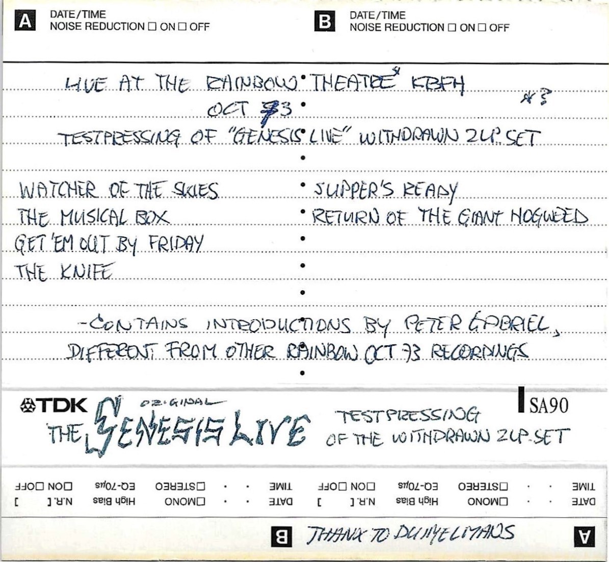 I happened to have a cassette which is a copy of the Dutch test pressing with ‘Supper’s Ready’ on it. Although it’s been bootlegged for years, I still like to think this is the real thing. The former owner obviously made a mistake by penning down that the recording is from the Rainbow Theatre, October 1973.
