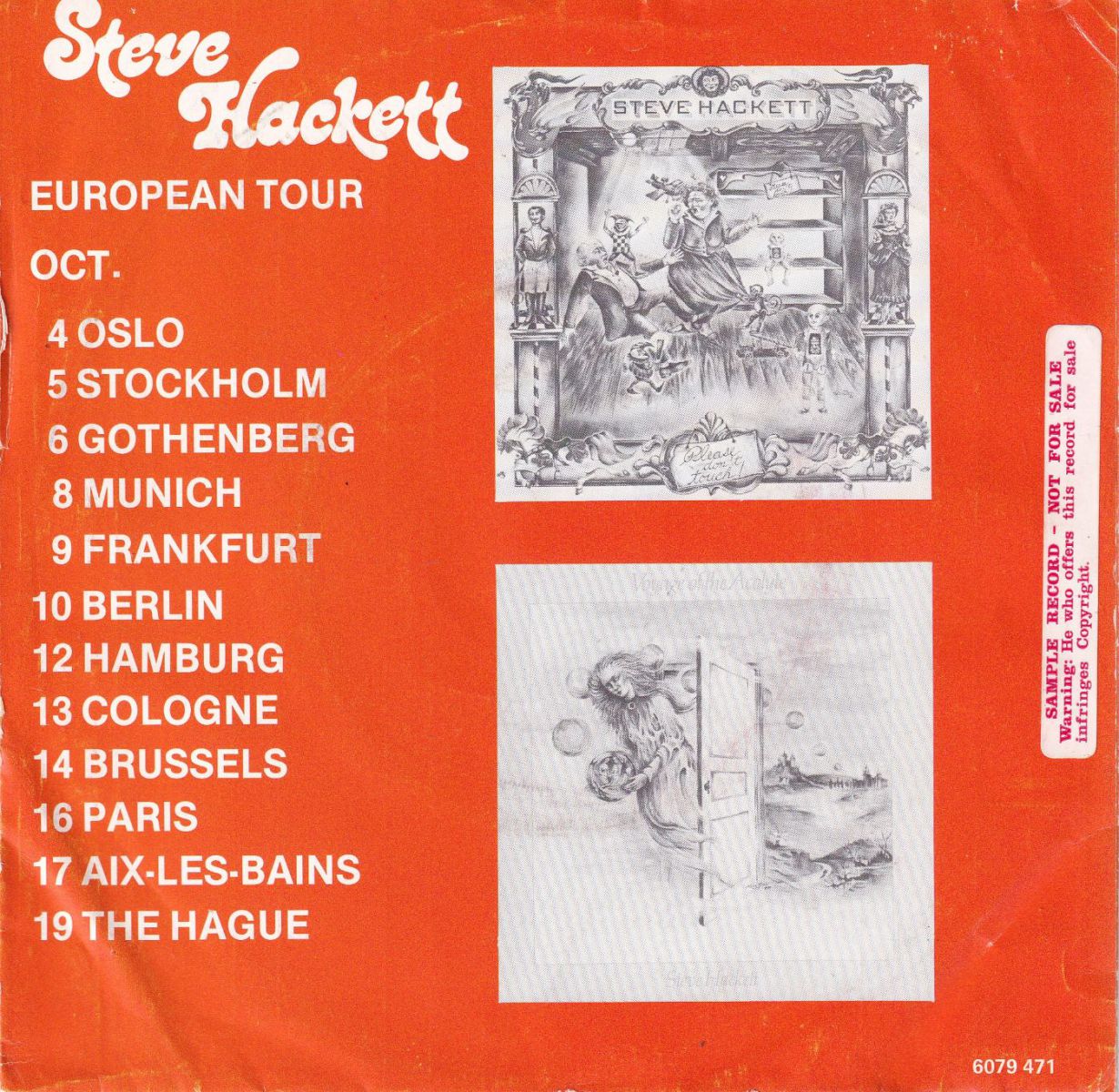 For his first solo tour Steve Hackett put a solid band toghether consisiting of Pete Hicks (vocals), Dik Cadbury (bass), Nick Magnus (keyboards), John Shearer (drums) and his brother John (flute). Hackett and his band played a good mixture of ‘Voyage’ and ‘Touch’ and (only?) two Genesis classics. The concert at The Congresgebouw in The Hague is listed on the back of the Dutch version of the ‘Narnia’ 7inch single. I’ve been looking for a ticket of the show for a few years now, but I haven’t been very succesful yet in my quest.