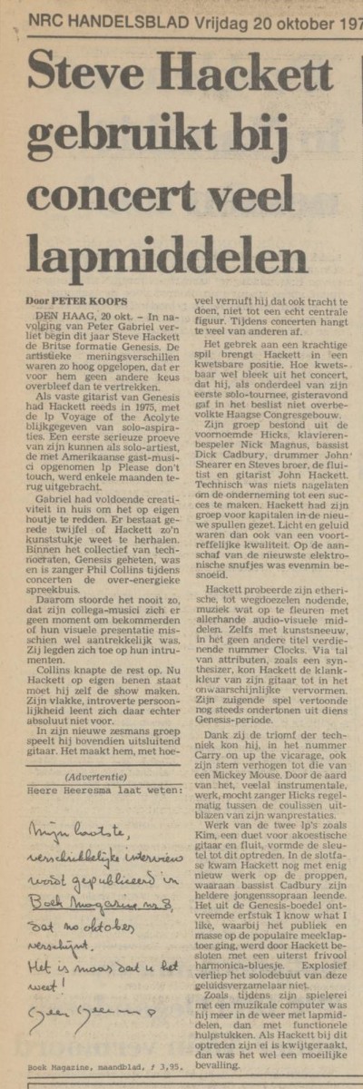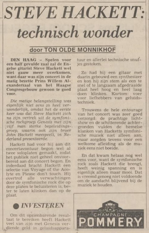 I found three reviews of the concert, one of which was not fully printed. The reviews are very mixed, going from ‘Hackett – A technical miracle’ to ‘…spruced up so as not to drift off to sleep’. One review, from newspaper Trouw, was even harsh: “His music can best be compared with cheap and hideous wallpaper.” The acoustic set in the middle of the concert was received with a more journalistic subtleness, even so was the stage production Hackett had invested in. All things considered, the critics weren’t convinced that Steve Hackett could make it on his own as a solo artist. As is turned out, he proved them wrong.