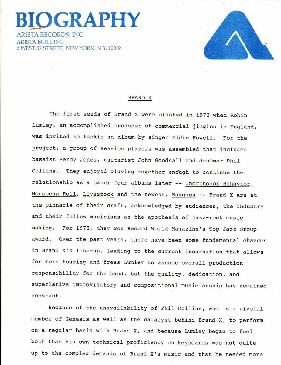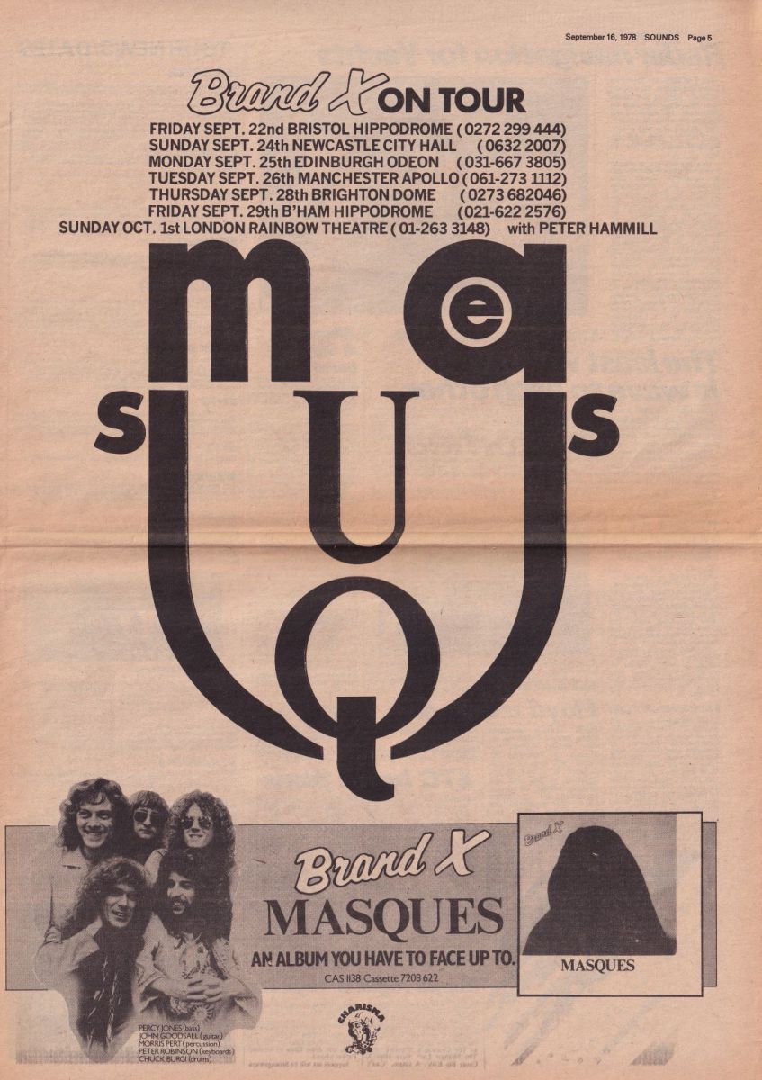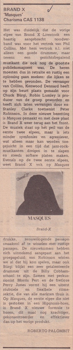 Because of Collins’s absence, I guess ‘Masques’ is not really a Genesis-related album. So why bother getting into this? For one, this period can be considered an important break for Collins from Brand X. He did a highly profiled album with Genesis (‘…And Then There Were Three…’) followed by a massive world tour. Secondly, Phil’s name was connected to Brand X, because of his acquired fame with Genesis, and he was mentioned in reviews and press statements. Thirdly, the ‘new’ personnal in Brand X consisted of Peter Robinson, who would later on play keyboards for Phil on his first two solo tours. I’d say the ‘Masques’ album was made in a significant period in Genesis’ history.