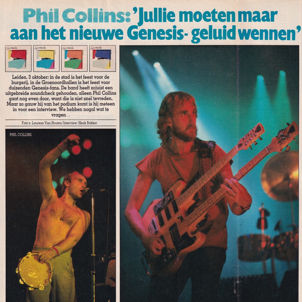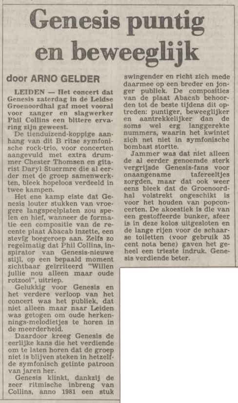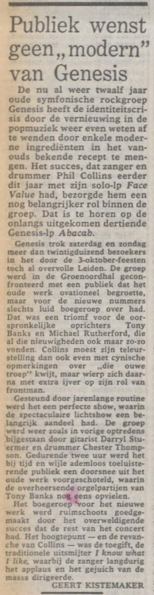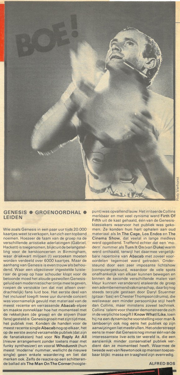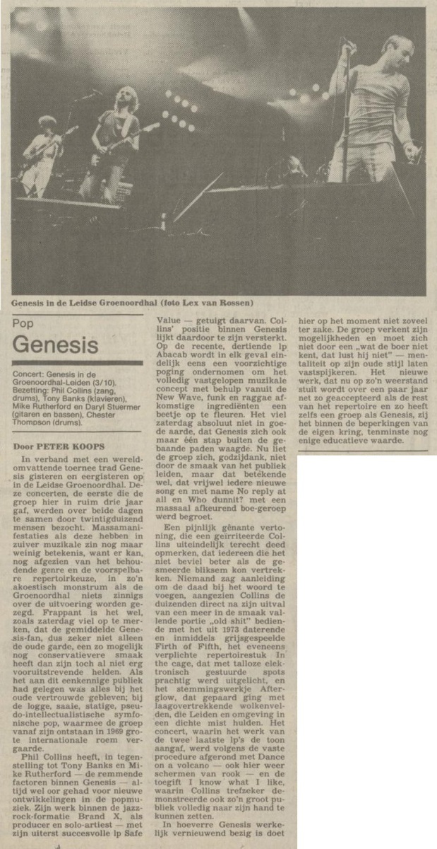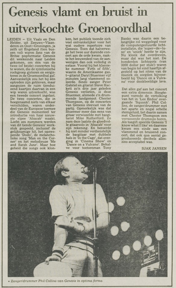 During the show the fans made it absolutely clear that they weren’t in any way impressed by Genesis’ new music. Finishing ‘Whodunnit’ and ‘No Reply At All’ the band was treated on a booing concert, the first time ever as Phil Collins later recalled. Cynically Phil Collins’ son-in-law (husband to Joely, Phil’s eldest daughter) is from Leiden. Who would have guessed?